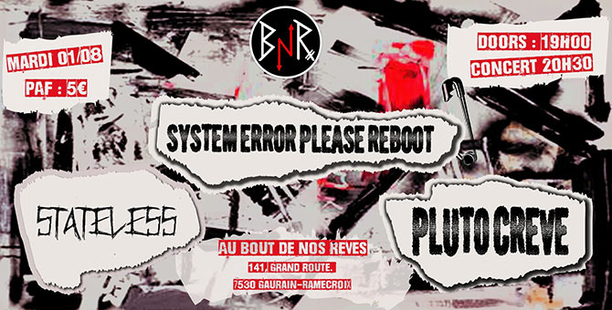 Accueil > Évènements en Belgique > Pluto Crevé + Stateless + System Error Please Reboot au BnR