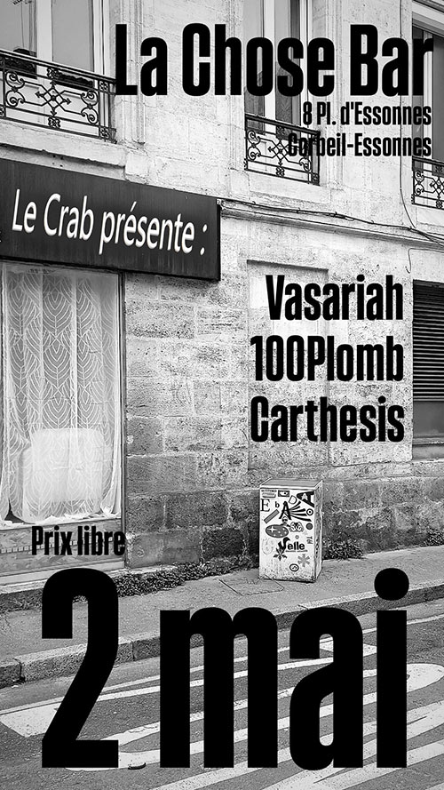 Ben toujours une grosse affiche à prix libre, toujours à la Chose, 3 groupes pour la toute première fois en partenariat avec le CRAB. Belle saison, probable beau temps et prix libre alors que demande le peuple ?
