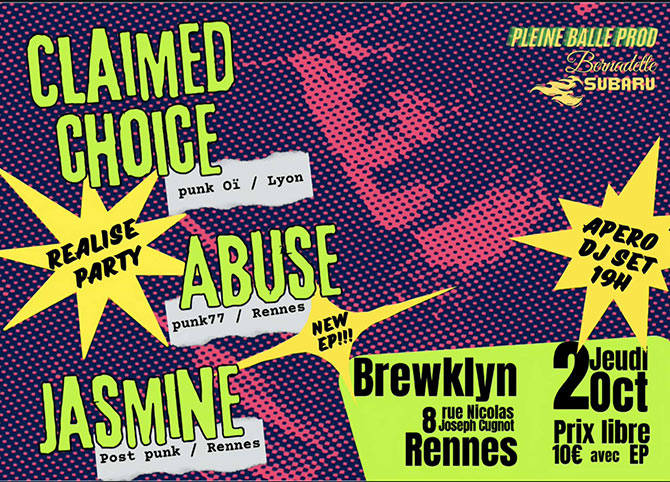 Accueil > Évènements en Bretagne > Claimed Choice + Abuse + Jasmine au Brewklyn
