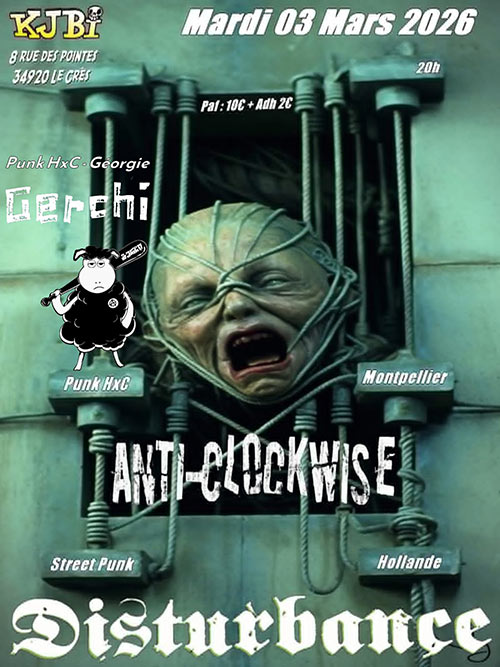 Accueil > Évènements en Languedoc-Roussillon > Anti-Clockwise + Gerchi + Disturbance au KJBi