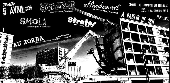Accueil > Évènements en Ile-de-France > Smola + Spont Ar Stad + Strates + Effondrement au Zorba