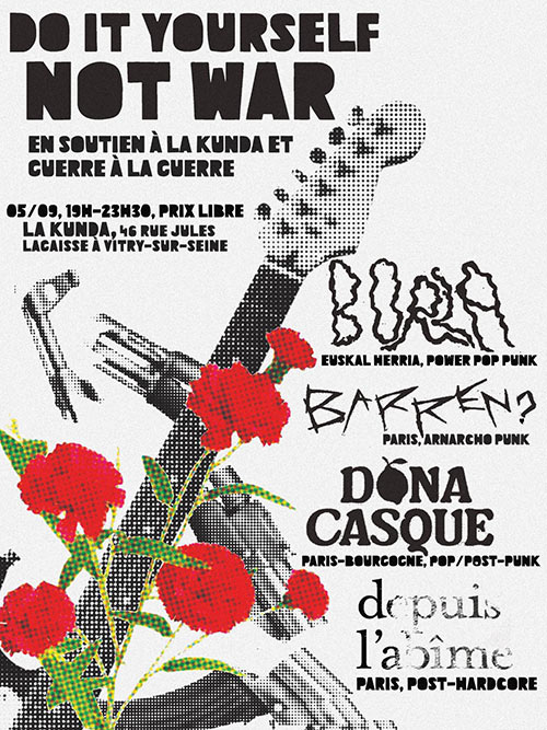 Depuis plus de 4 ans, la Kunda est un haut lieu d'accueil, d'auto-organisation et de lutte. Plus récemment la maison est aussi devenue un incontournable des scènes contre culturelles. Avec ce concert, soutenons ce lieu souvent attaqué mais jamais ébranlé, ainsi que Guerre à la Guerre, une grande initiative unitaire contre la militarisation de la société et l'économie de guerre. Un slogan : paix entre les peuples, guerre entre les classes. Montrons notre solidarité et continuons à nous organiser !