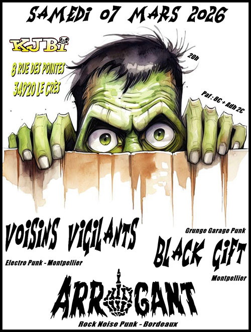 Accueil > Évènements en Languedoc-Roussillon > Arrogant + Voisins Vigilants + Black Gift au KJBi