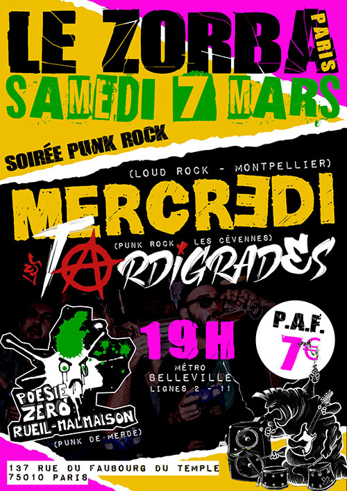 LES TARDIGRADES sont un jeune groupuscule de punk-rock, actif depuis 2019. Leur QG est à St Bauzille-de-Putois, la porte sud des Cévennes. Se produisant aussi bien dans les ZAD, les bars, la rue, les squats que les salles de concerts, leur show se veut sauvage, efficace, sans concessions et très communicatif. Au menu pour le pogo : que des compos vénères, chantées en français ! Les paroles sont résolument dénonciatrices, anti-capitalistes et révolutionnaires, dans la même veine que des groupes comme Les Sales Majestés, Tagada Jones ou encore Bérurier Noir.