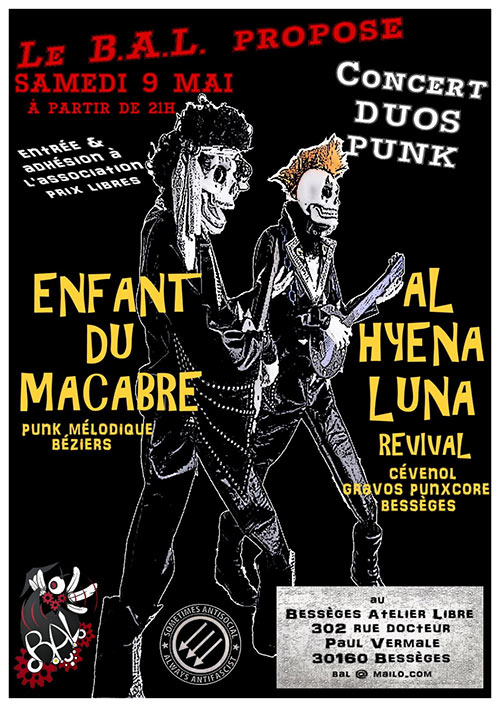 Pour clôturer une journée portes ouvertes de l'asso Bessèges Atelier Libre, "Le Printemps du B.A.L.", un ptit concert de duos Punks avec ENFANT DU MACABRE et AL'HYENA LUNA Revival.