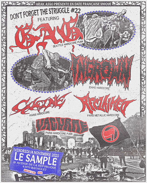 Avec une discographie longue comme le casier judiciaire de Sarko et Le Pen, GAG ne s'était jamais produit à Paris ! Et pourtant, la formation de Washington formée au début des années 2010 n'a cessé de retourner toutes les scènes sur lesquelles elle est passée avec son hardcore punk radical, cru et incorruptible dont on pourrait résumer l'attitude par des titres comme "No Cops" ou encore "I'm A Punk". À ne pas manquer !