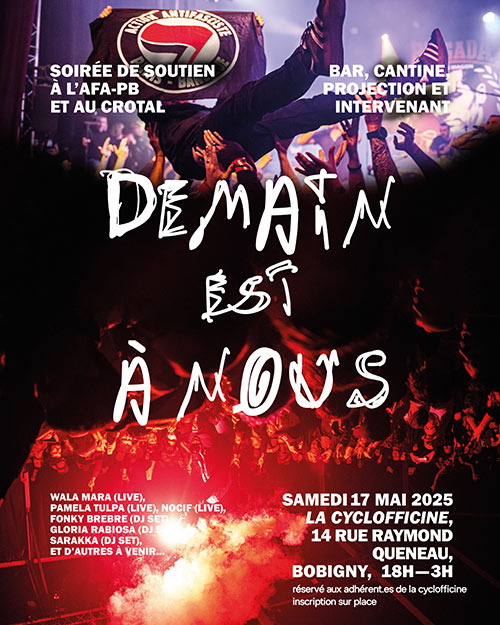 Les bénéfices de la soirée seront reversés au Crotal et à l'AFA coorganisateur.ice.s de la soirée