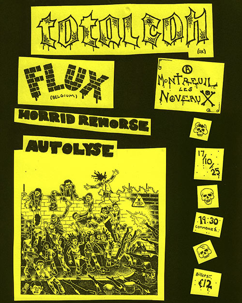 Accueil > Évènements en Ile-de-France > Total Con + Flux + Horrid Remorse + Autolyse @ Nouveaux Sauvages