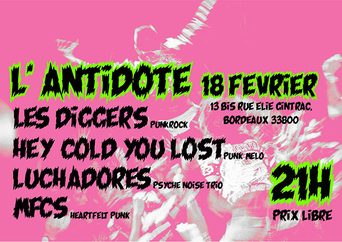 Accueil > Évènements en Aquitaine > Les Diggers + Hey Cold You Lost + Luchadores + MFCS à l'Antidote