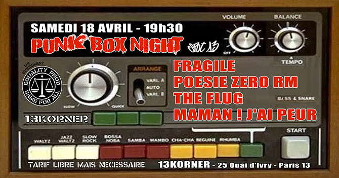 Accueil > Évènements en Ile-de-France > PUNK BOX NIGHT - Fragile / PZRM / The Flug / Maman! J'ai Peur