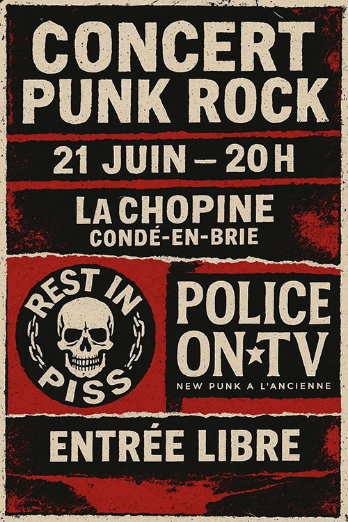 Rest In Piss (D-beat joyeux) + Police on TV (new old punk) à la Chopine de Condé en Brie à l'occasion de la Fête de la musique !! Concert gratuit