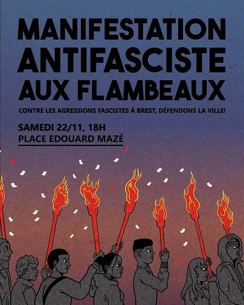 Le samedi 22 novembre, nous appelons à venir manifester à la lueur des flambeaux pour une marche antifasciste et antiraciste flamboyante. Contre la recrudescence des actes fascistes à Brest, qui apporte violence et terreur sur la ville, faisons percer la lumière à travers l'ombre brune. Montrons que Brest est une ville antifasciste et antiraciste forte de toute sa diversité ! Ces fascistes veulent nous emmener vers les ténèbres avec leurs idées racistes, homophobes, antiféministes, leur dégoût de l'égalité et leur haine de la différence. Ces idées sont des menaces, combattons les !